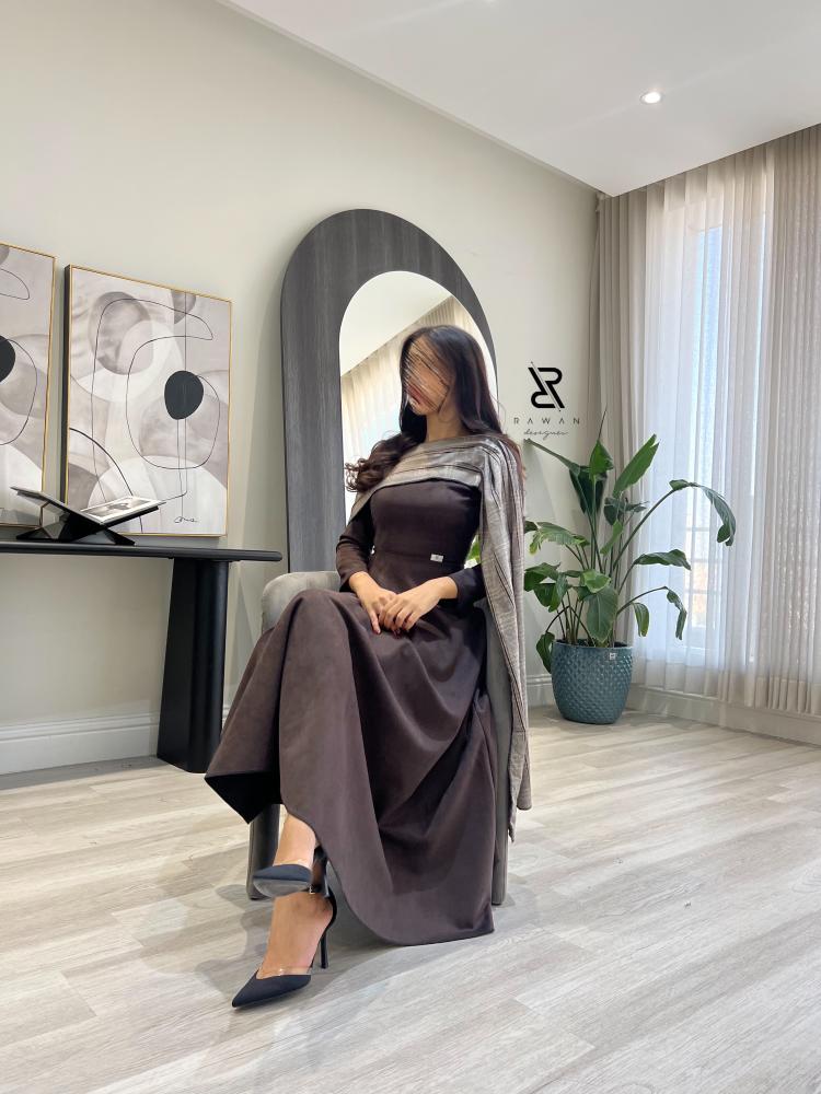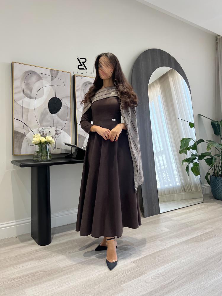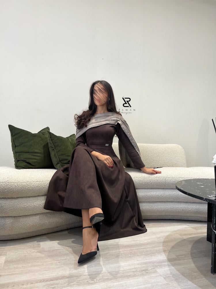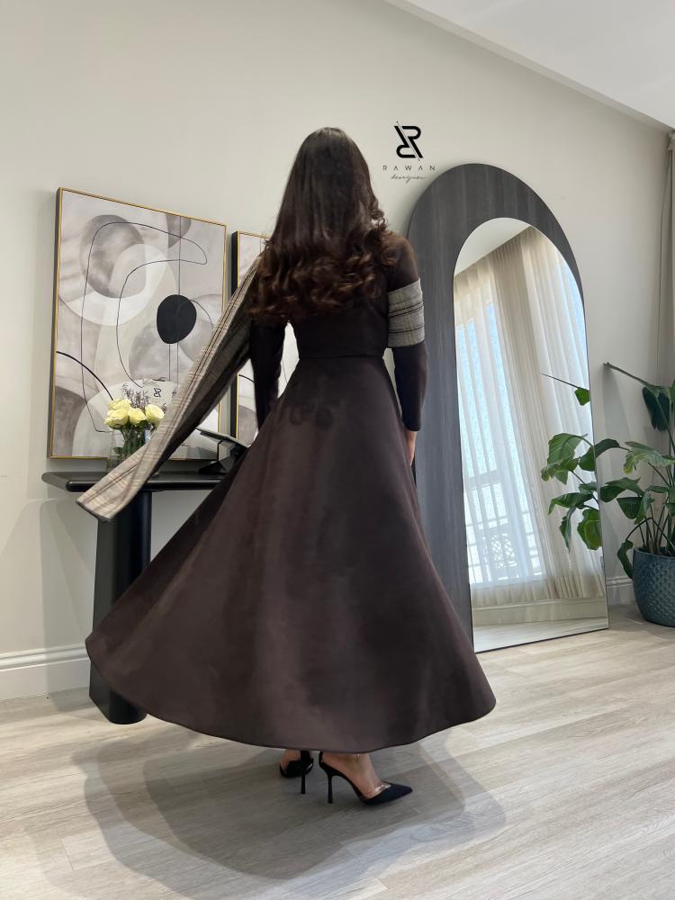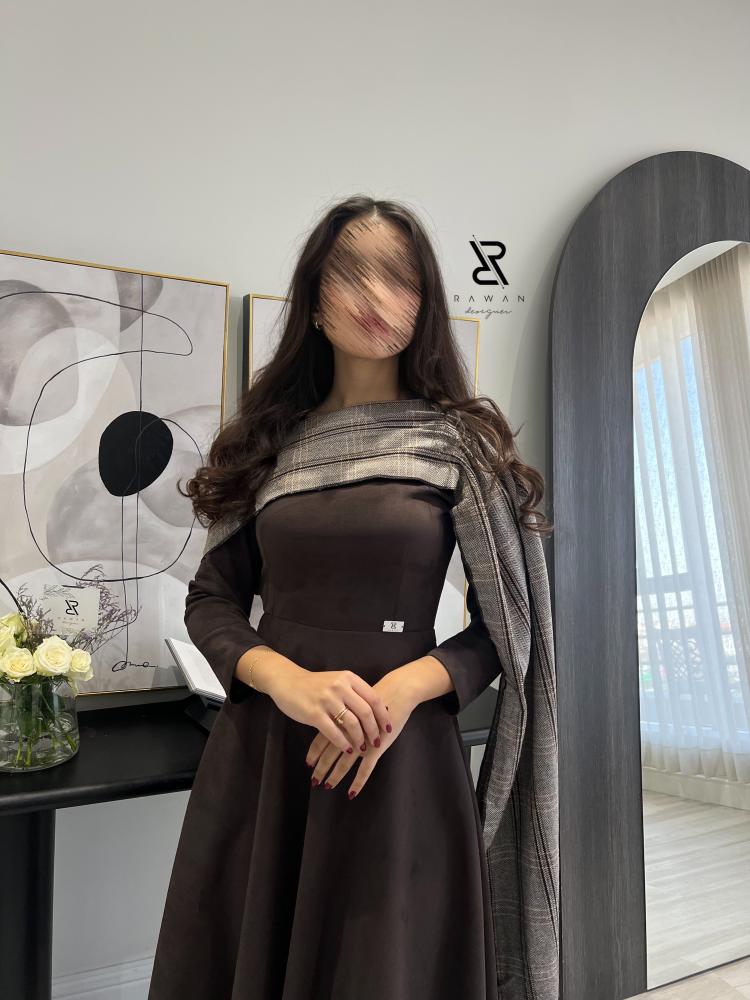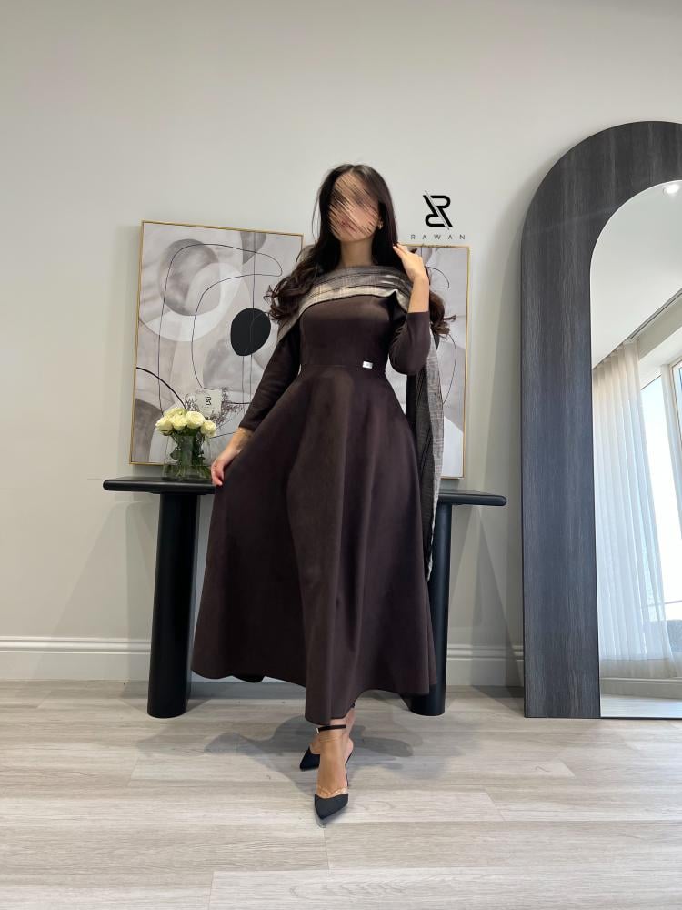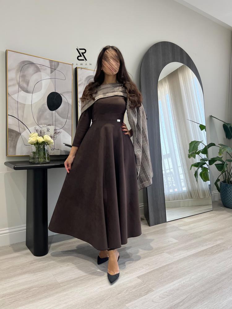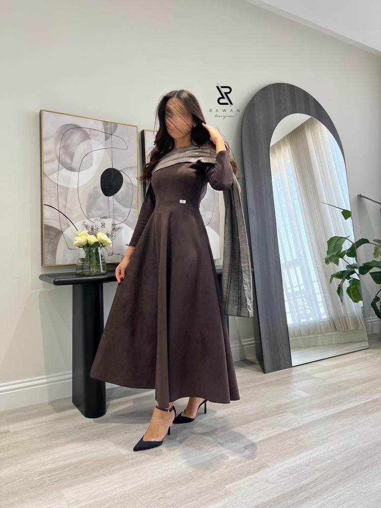 فستان ناعم مناسب للشتاء صنع الفستان من قماش الشامواه البني الغامق المطفي و مزين بقماش مميز على الاكتاف .