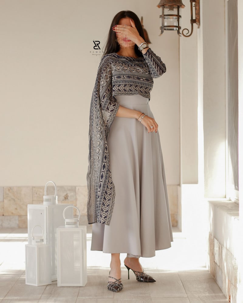 فستان ناعم وانيق صنع الفستان من قماش التفته المطفي و مزين بصدريه من الشيفون المطرز بخيوط الزري