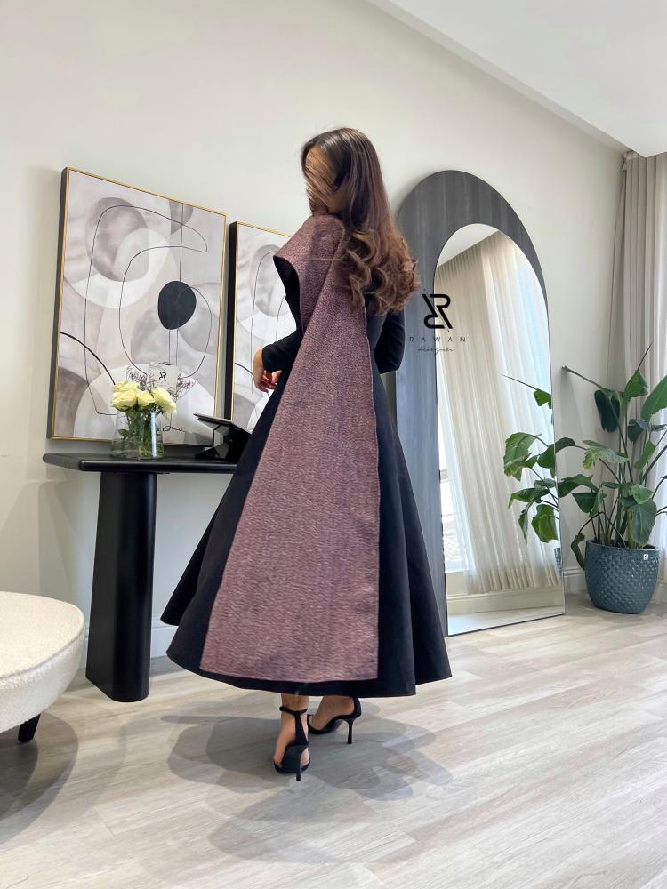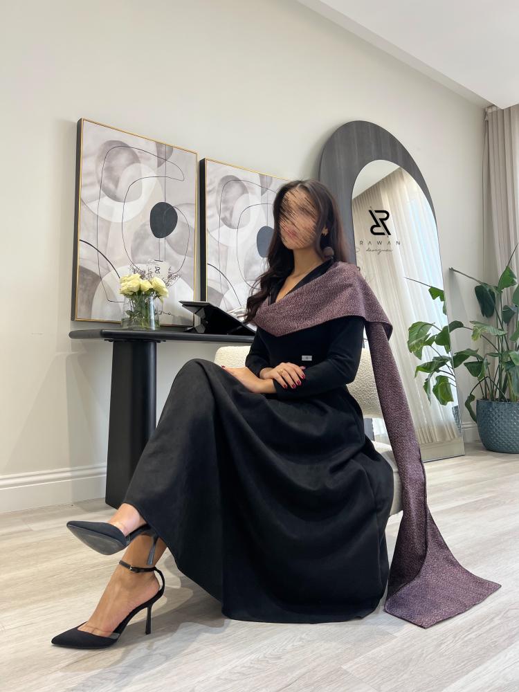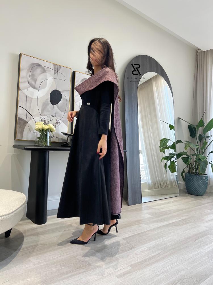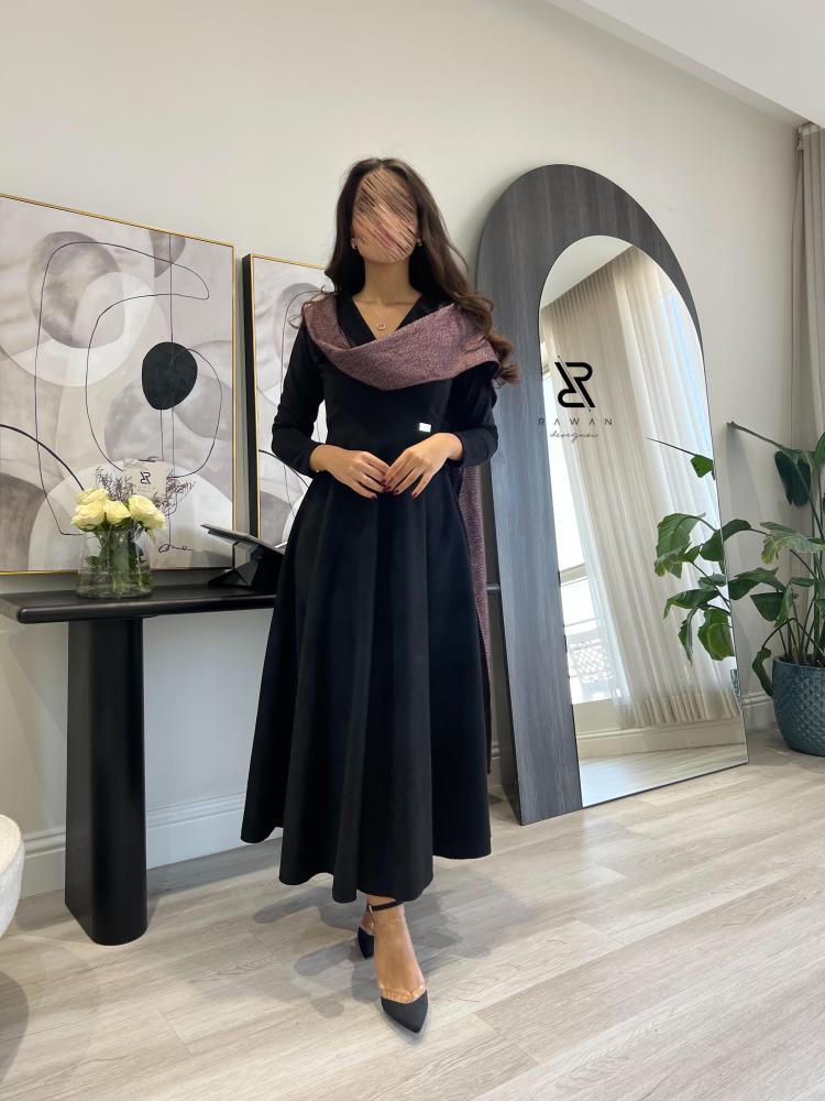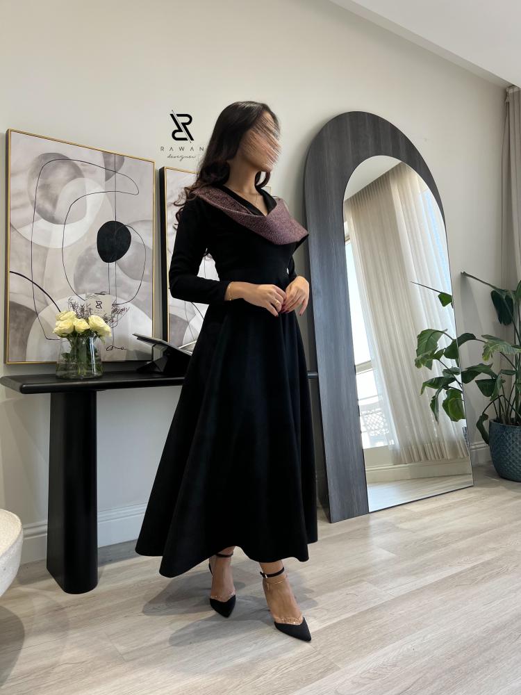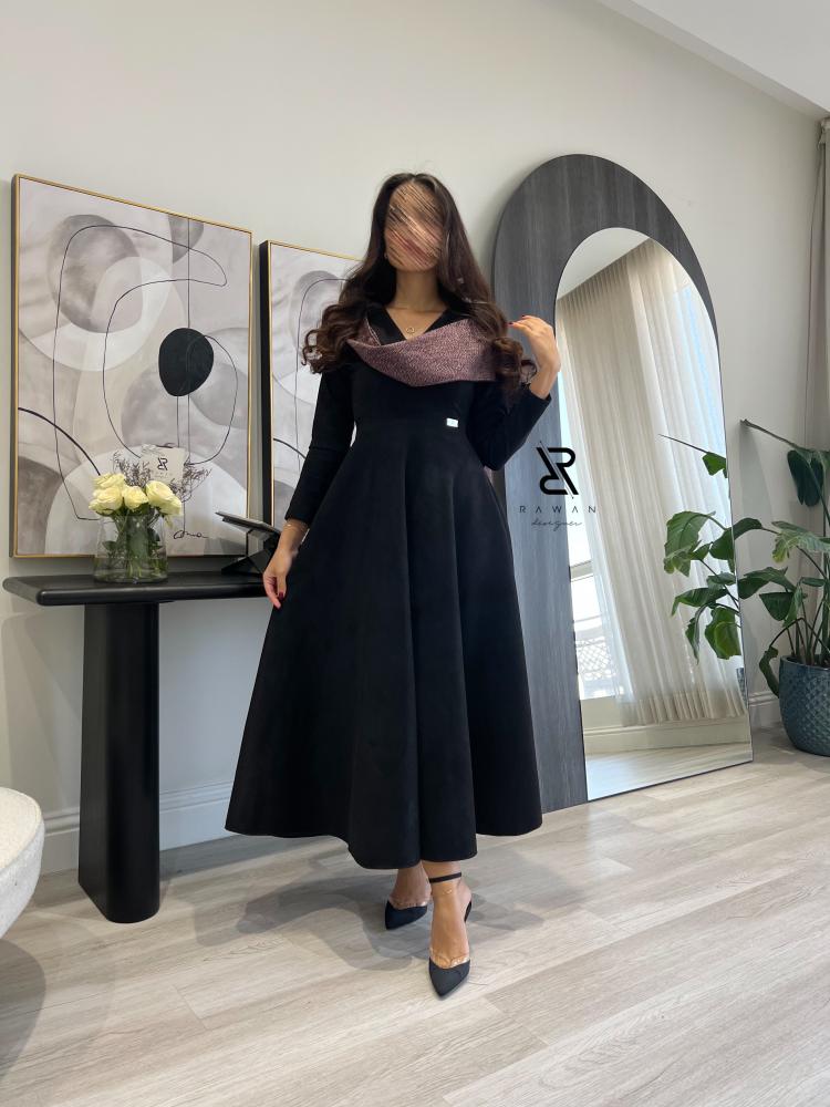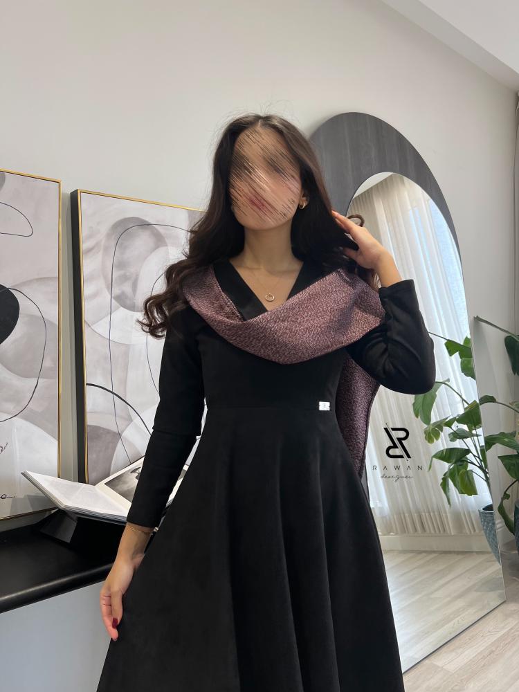 فستان ناعم مناسب للشتاء صنع الفستان من قماش الشامواه الاسود المطفي و مزين بقماش بلون عنابي على الاكتاف .