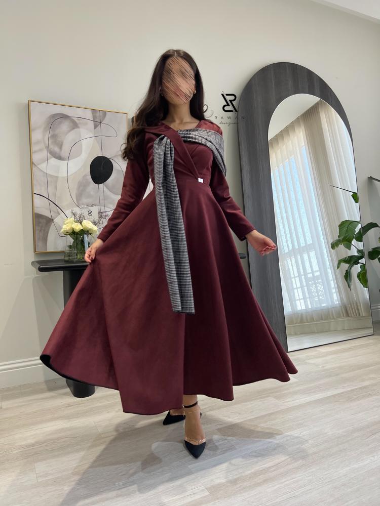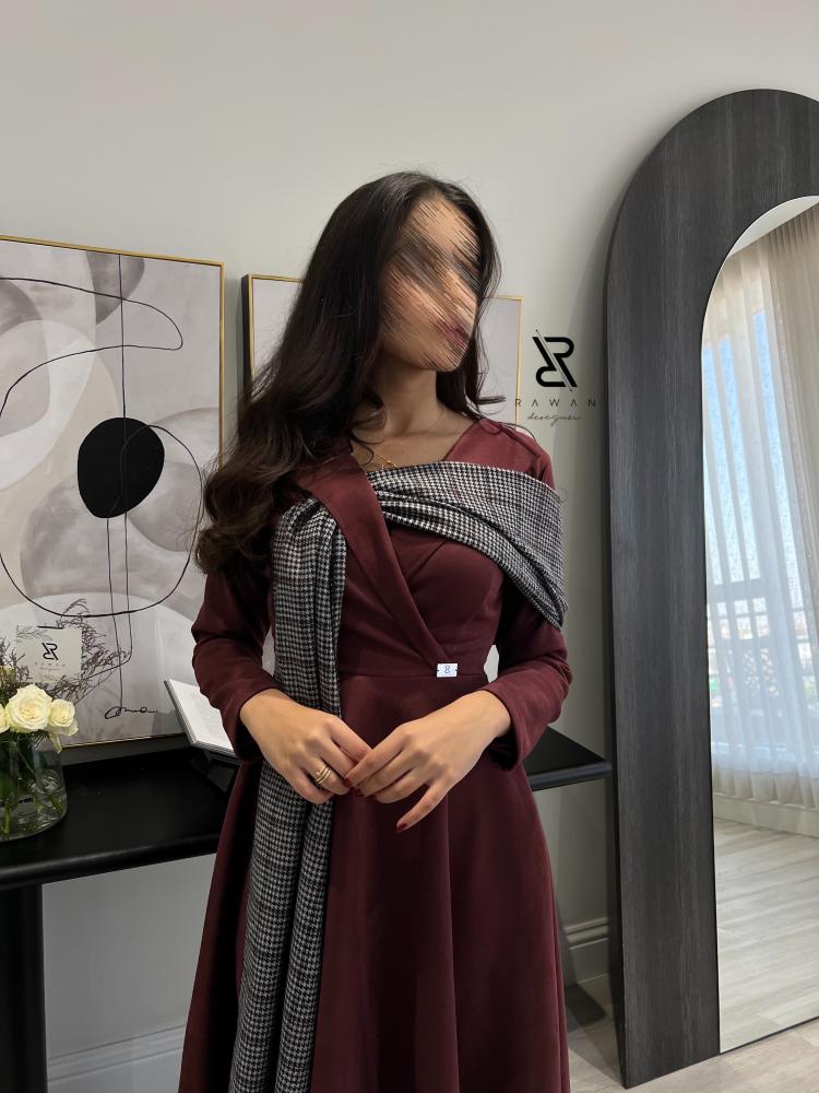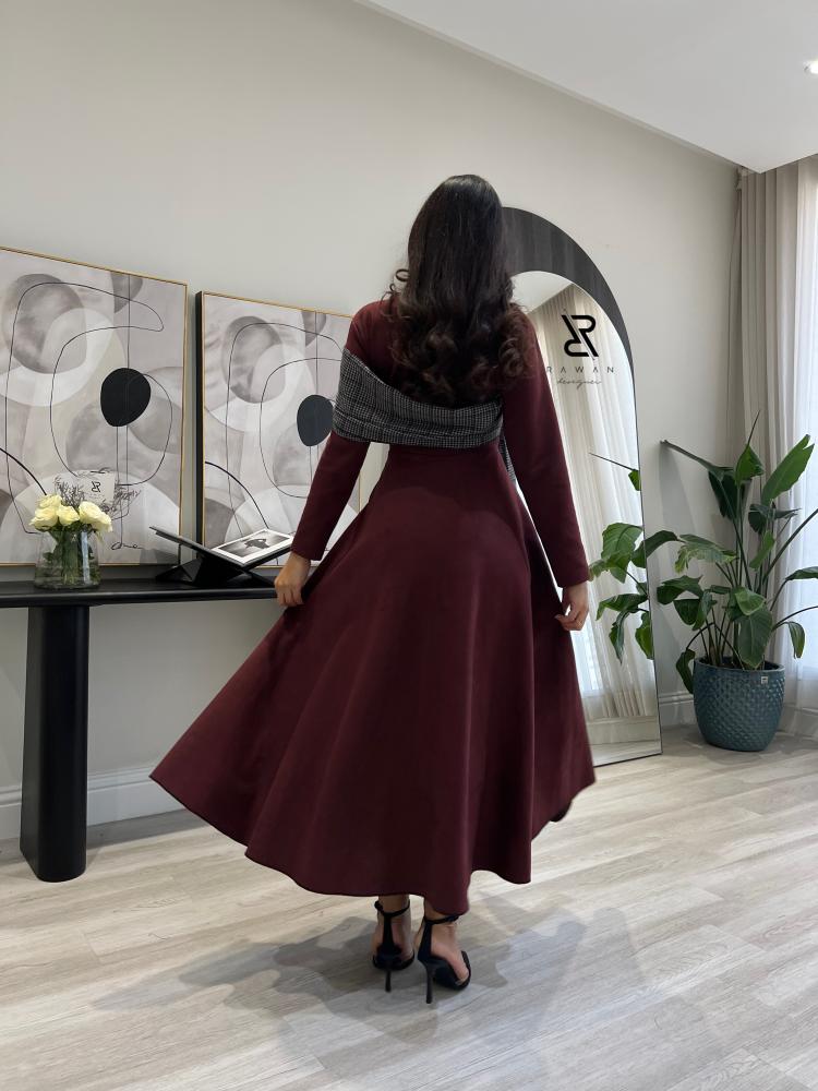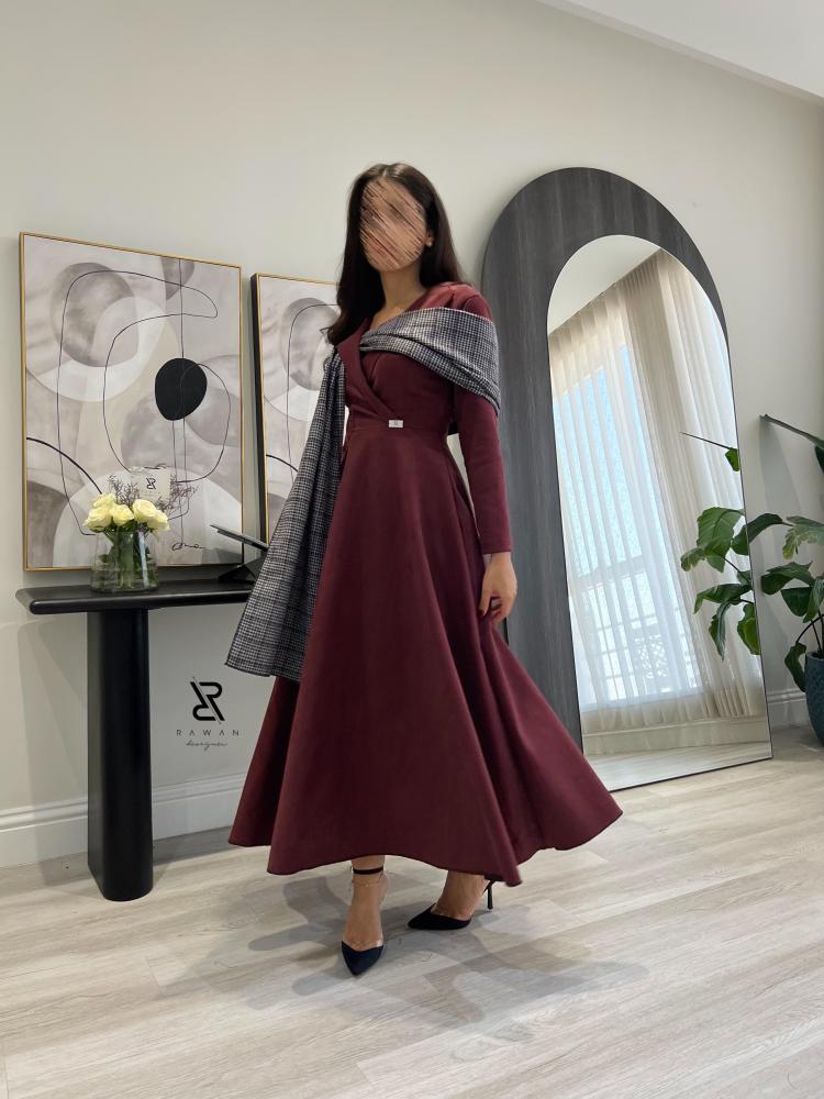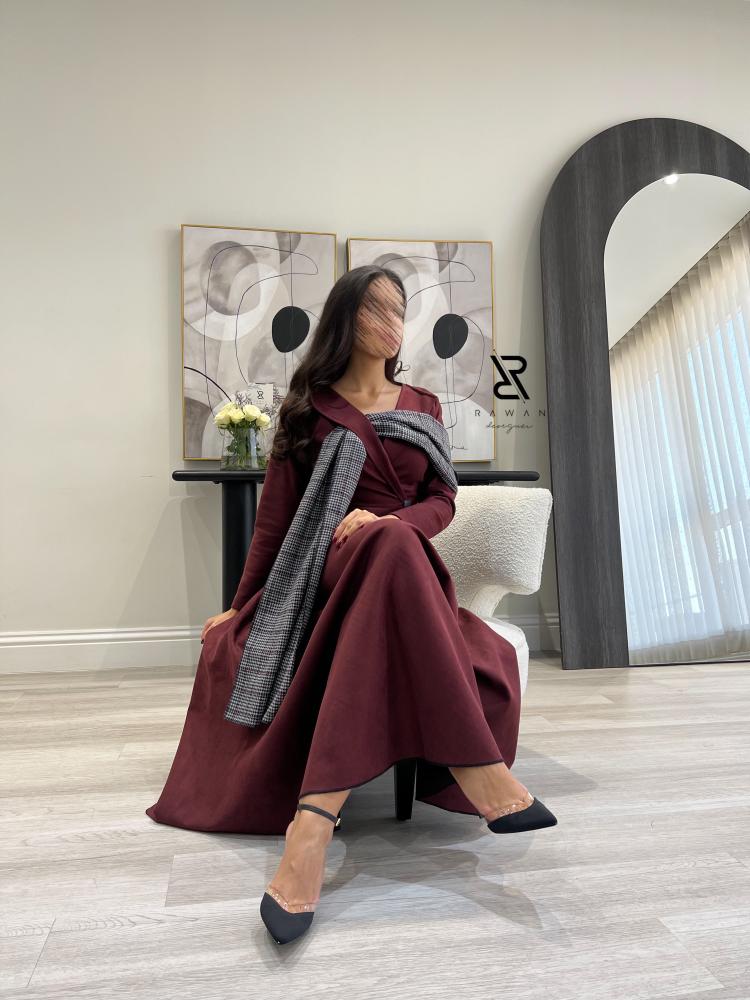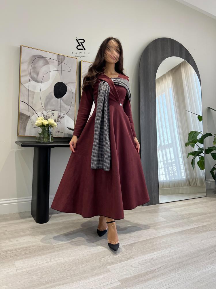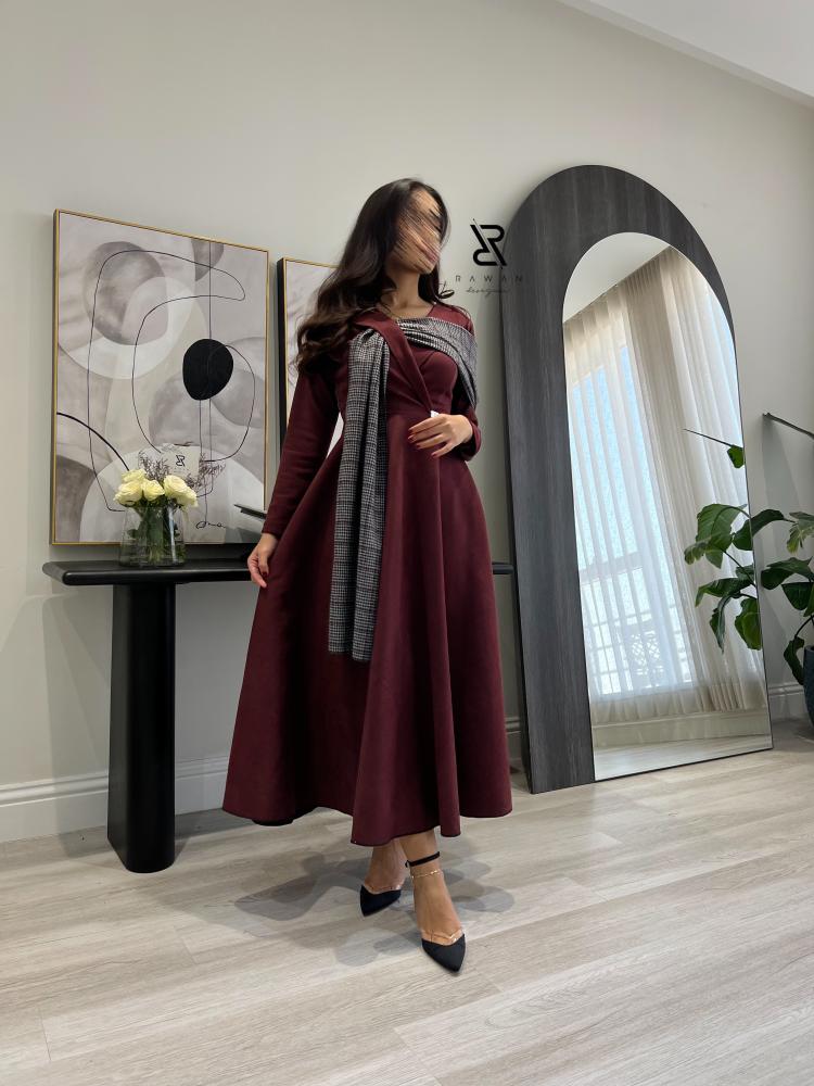 فستان ناعم مناسب للشتاء صنع الفستان من قماش الشامواه بورغندي المطفي و مزين بقماش مميز على الاكتاف .