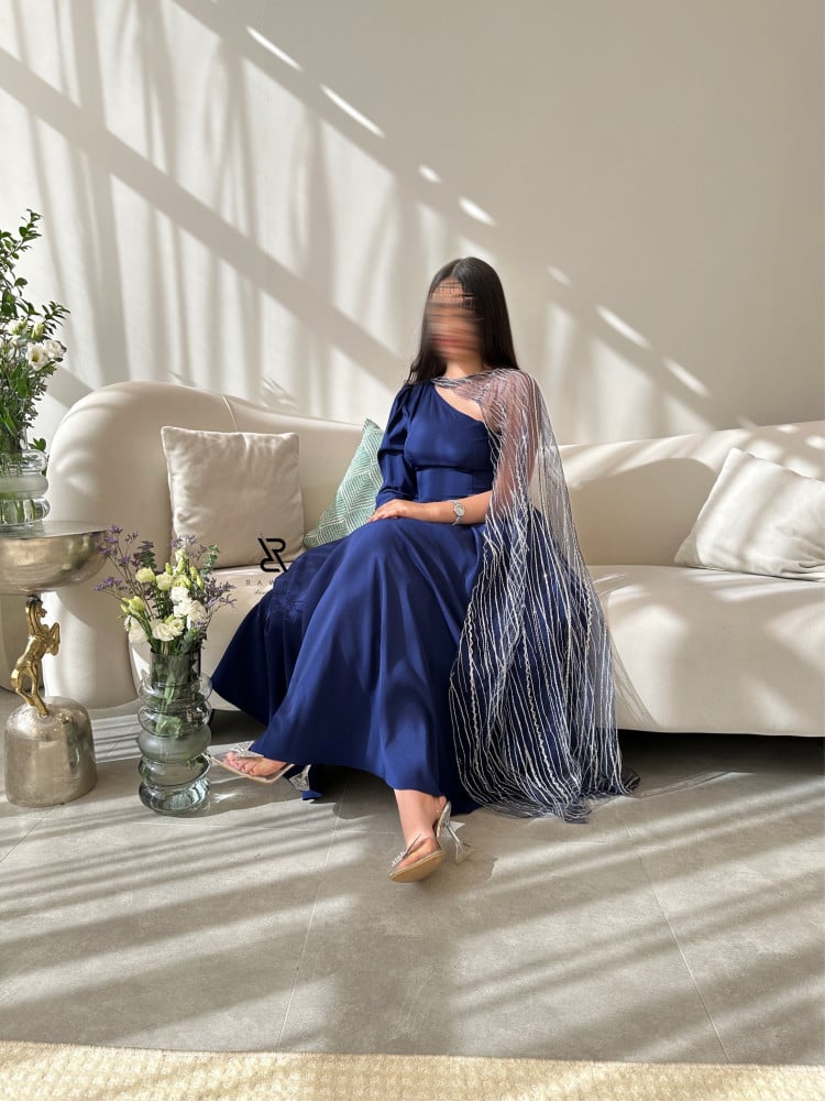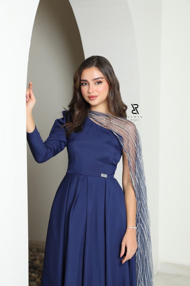 صنع الفستان من قماش التفته المطفي و مزين باكمام مطرزة