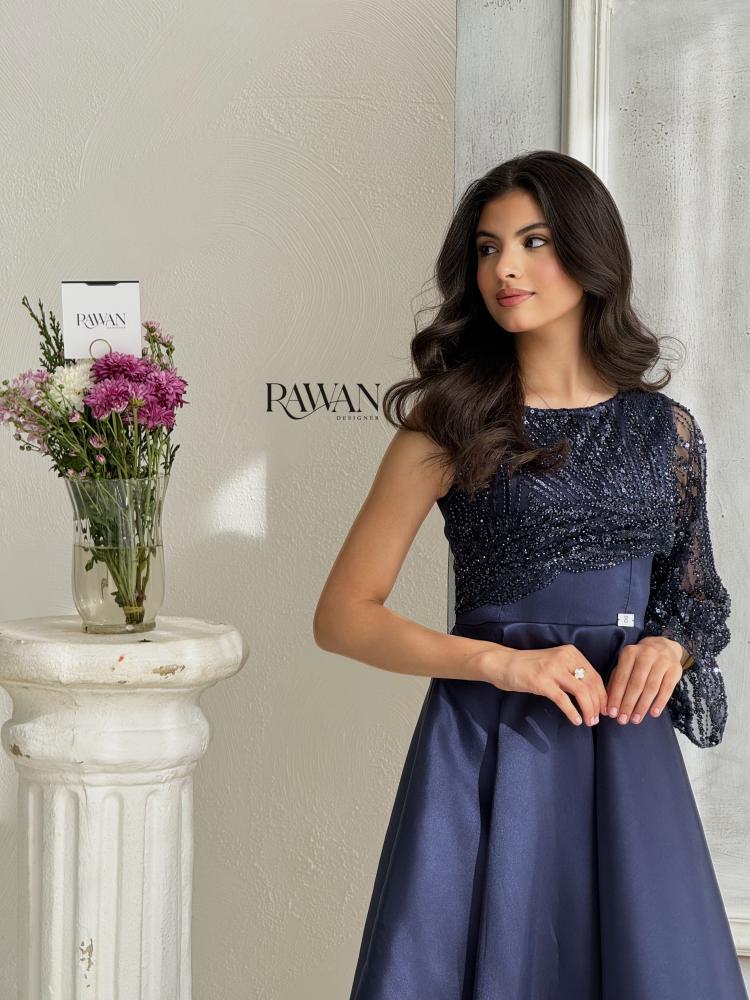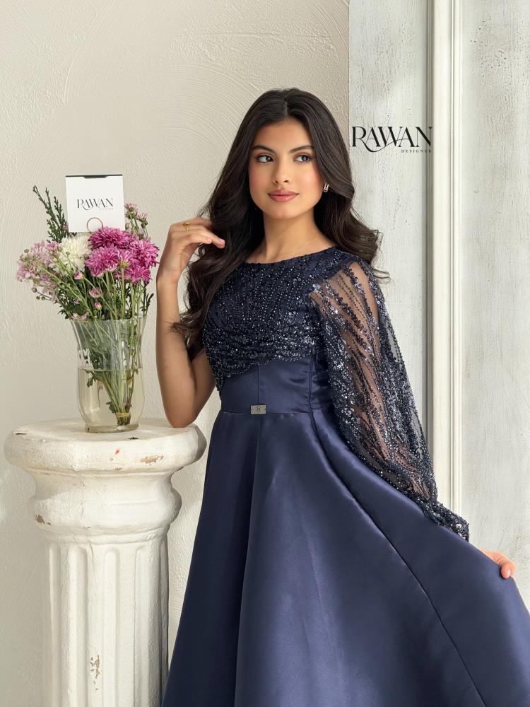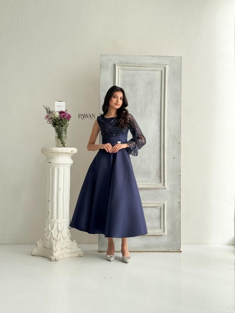 صنع الفستان من قماش التفته الميكادو و مزين بـ شك على الصدريه والكم