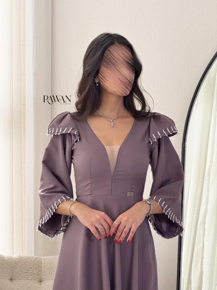 فستان ناعم وانيق صنع الفستان من قماش التفته المطفي بقصه اكمام و بتفاصيل لولو بالأطراف