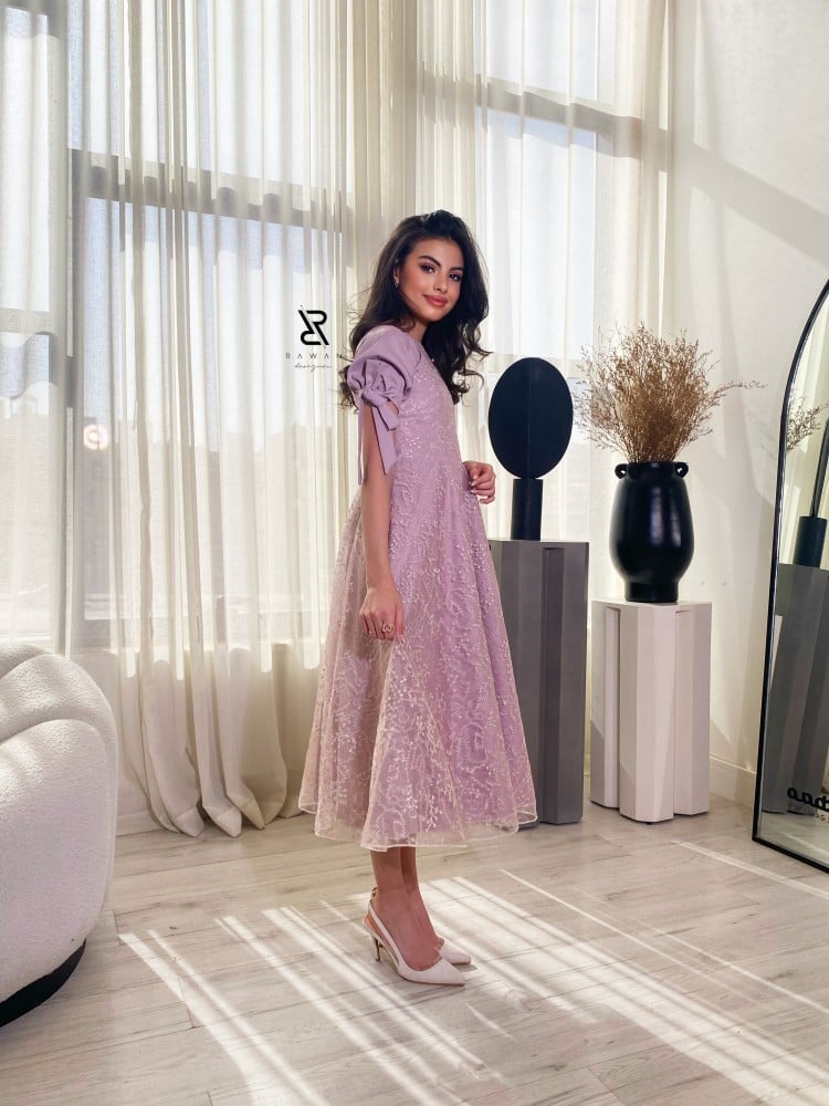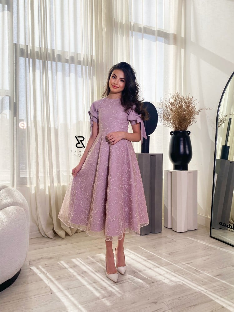 فستان ناعم وانيق صنع الفستان من قماش التفته المطفي و مزين ب تل بتفاصيل تطريز